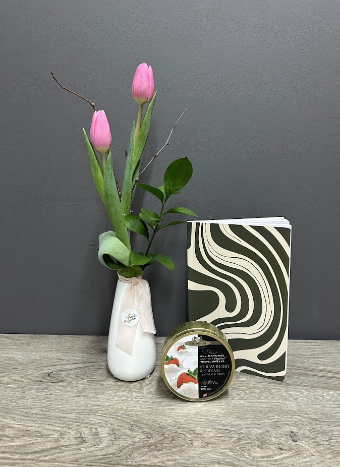 Cet ensemble comprend de fraîches tulipes soigneusement présentées dans un vase élégant, accompagnées de bonbons gourmands et d’un carnet de notes moderne.