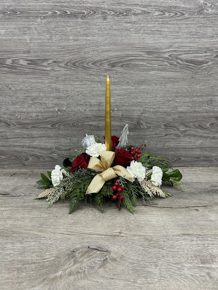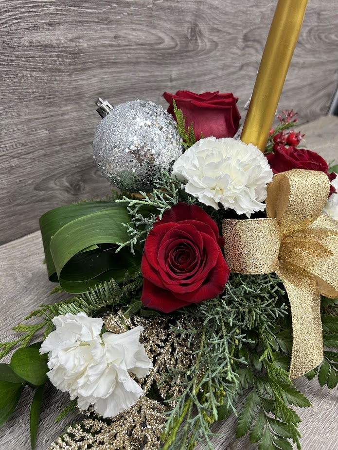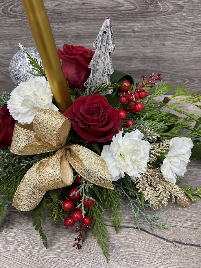 Faites rayonner votre décor des Fêtes avec Lumière d’Or, un centre de table classique et raffiné qui apporte une ambiance chaleureuse et festive à tout espace. Cette création met en vedette une chandelle dorée élancée, symbole de lumière et de célébration, entourée de roses rouges veloutées, d’œillets blancs immaculés, de baies rouges éclatantes et de feuillages hivernaux soigneusement agencés.