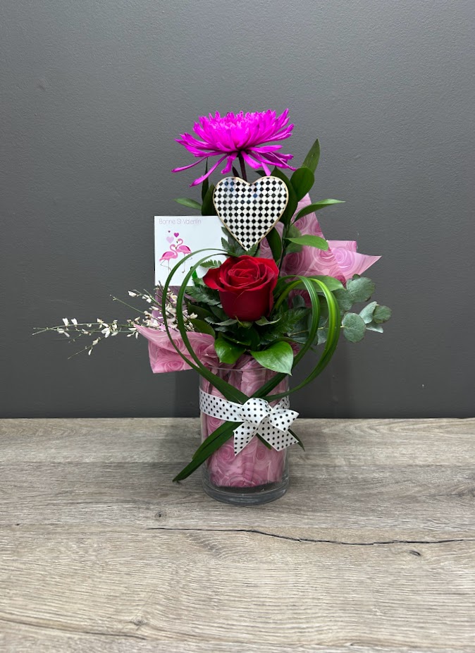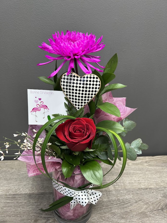 Pour parfaire le tout, un cœur en métal noir et blanc vient ajouter une note romantique et vintage. Un bouquet parfait pour une Saint-Valentin élégante et pleine de caractère, digne des plus belles histoires d’amour en noir et blanc… mais avec une touche de rouge passion! ❤️