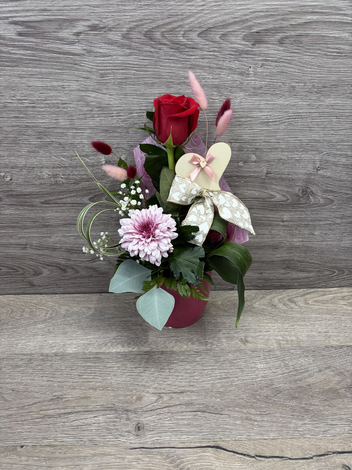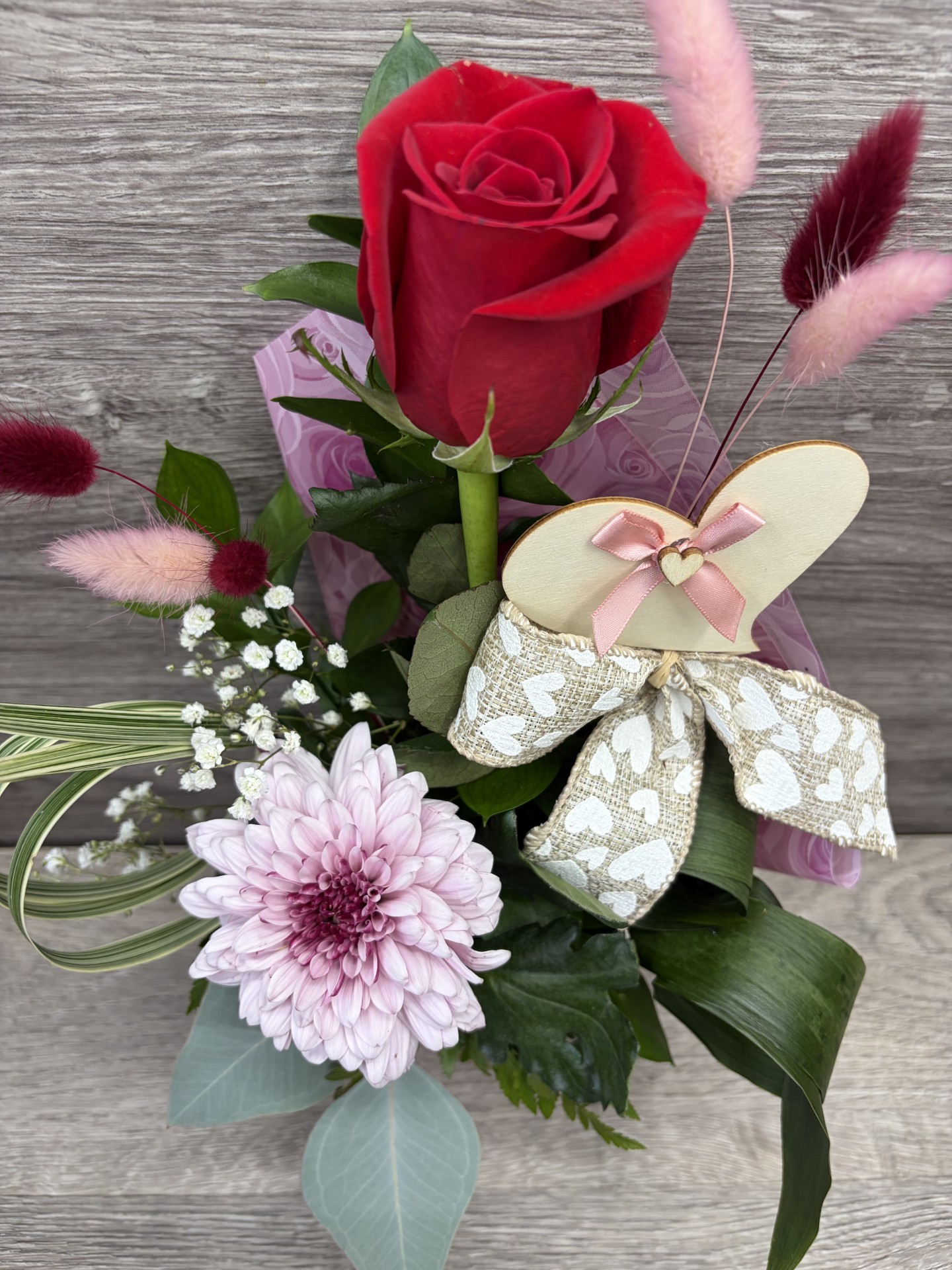 Au cœur de cette composition, une magnifique rose rouge, symbole de passion, s’harmonise avec un somptueux chrysanthème Fudji, apportant une touche d’éclat et de raffinement.