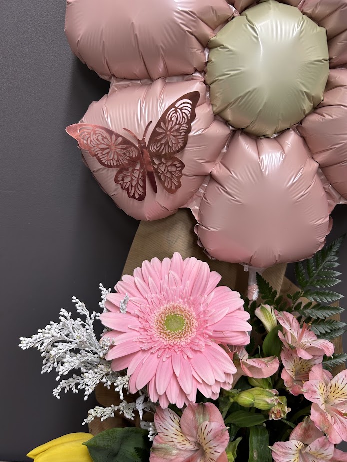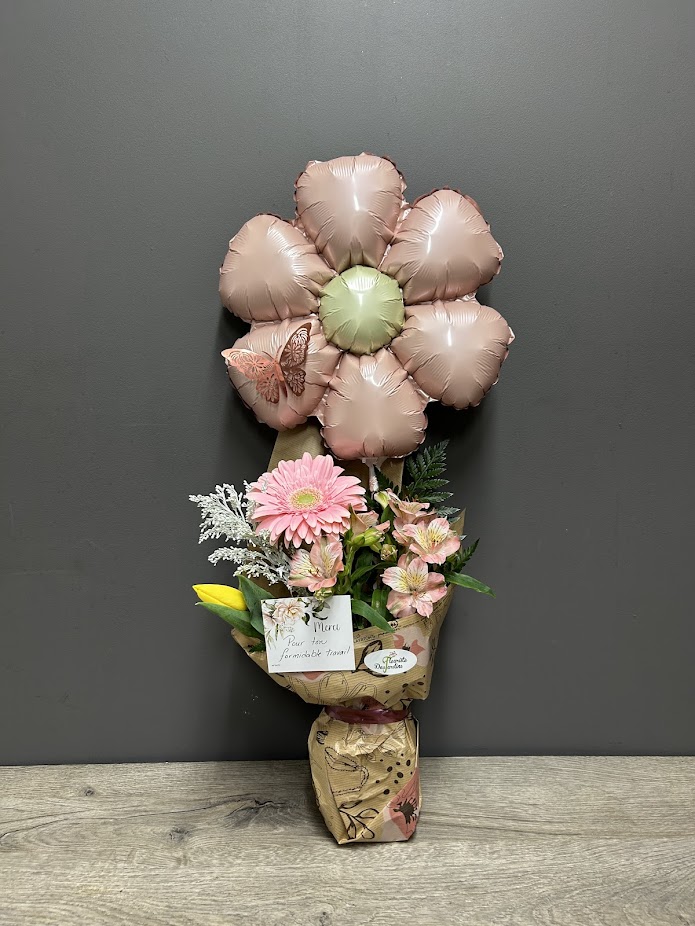 Ce bouquet combine de belles fleurs fraîches aux teintes douces avec un ballon en forme de fleur, pour un effet à la fois élégant et ludique.