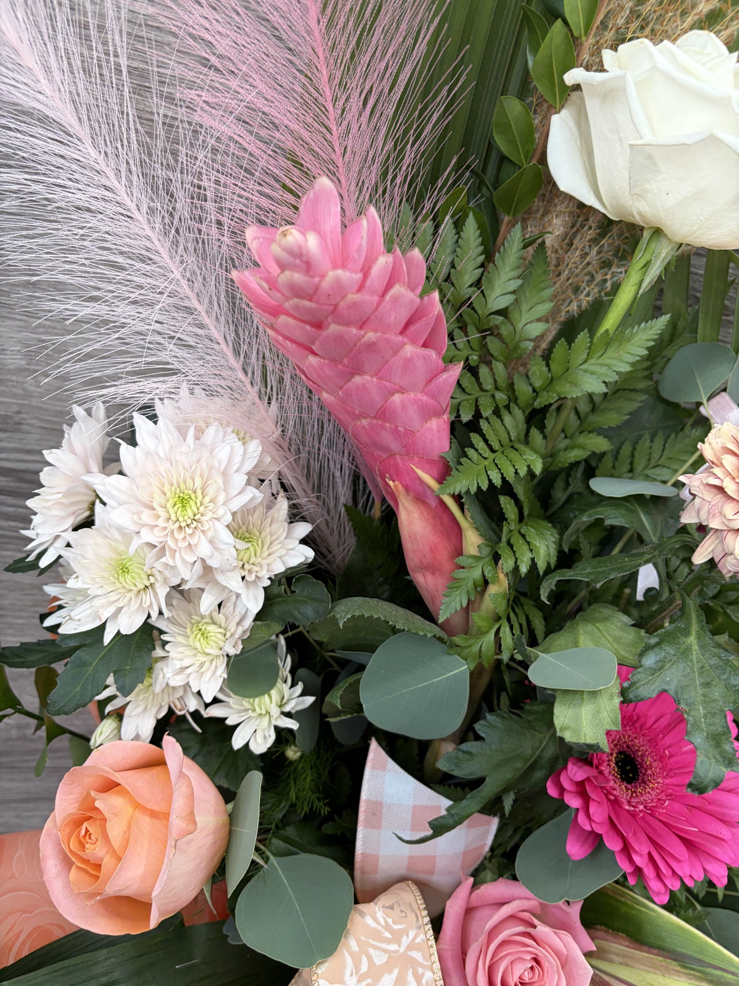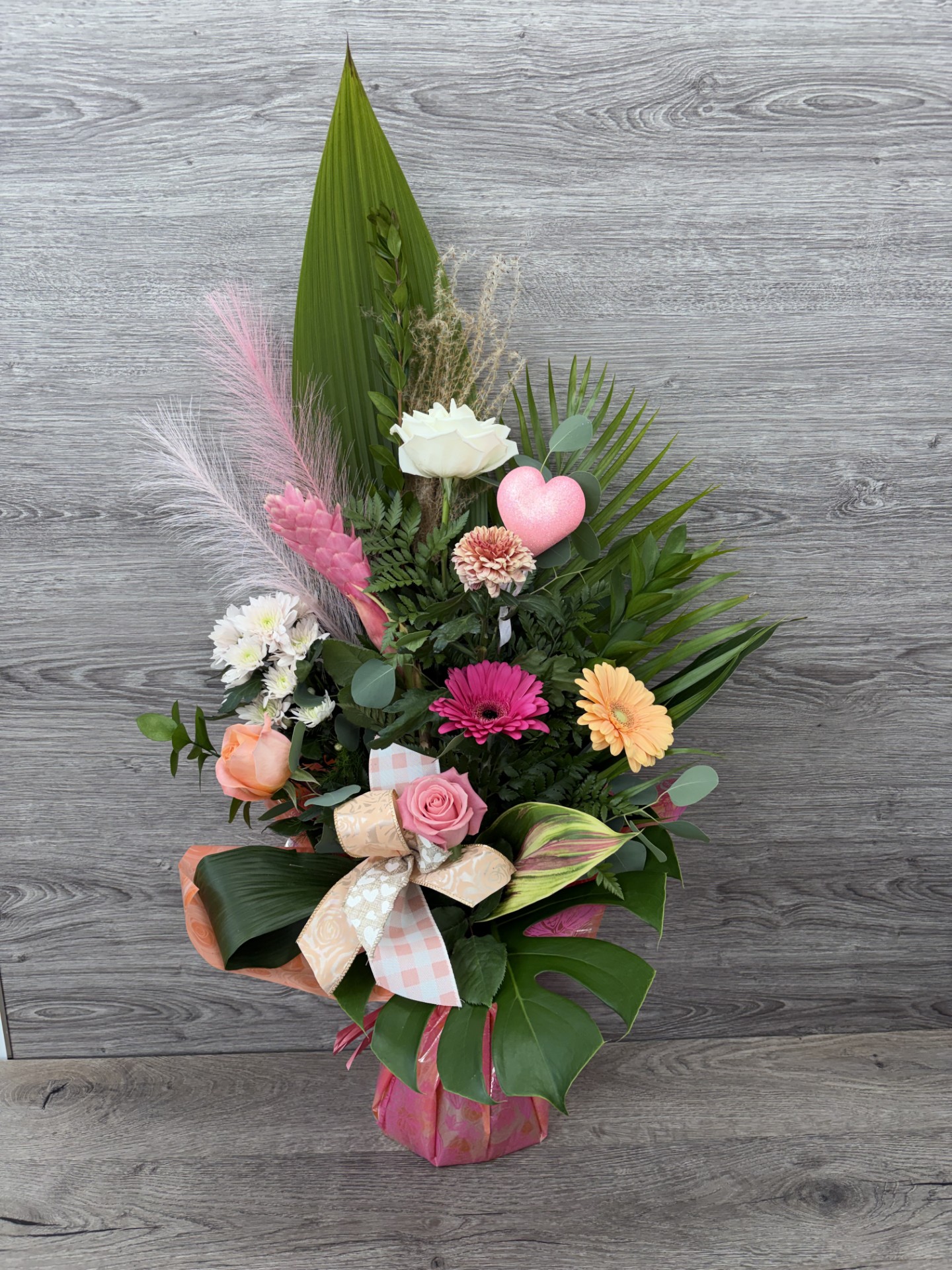 Un arrangement généreux et spectaculaire composé de roses élégantes, sublimées par deux gerbera lumineux qui apportent éclat et douceur. En son centre, un magnifique cœur rose devient le symbole d’un amour assumé, sincère et profond.